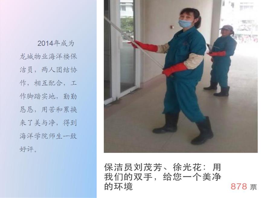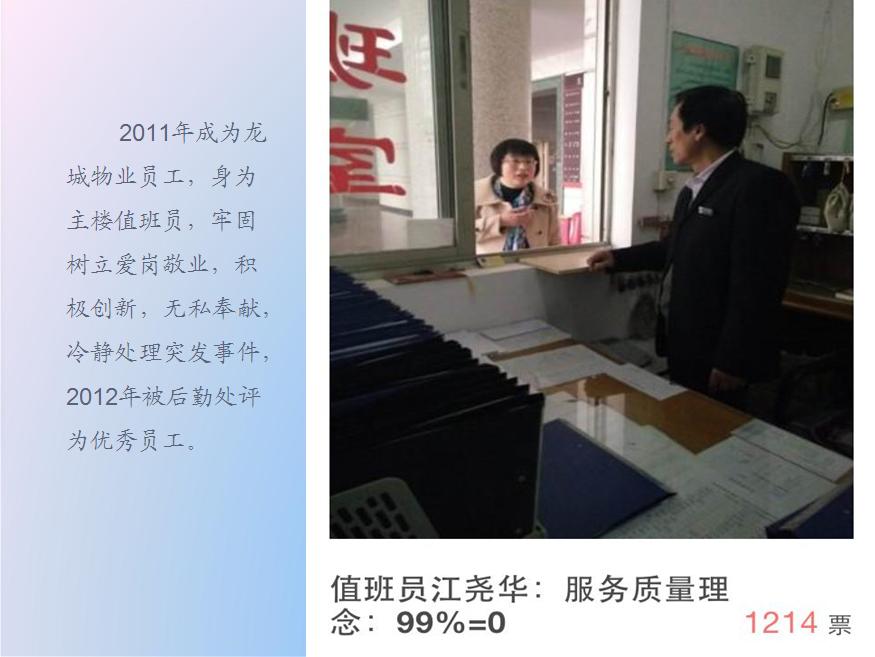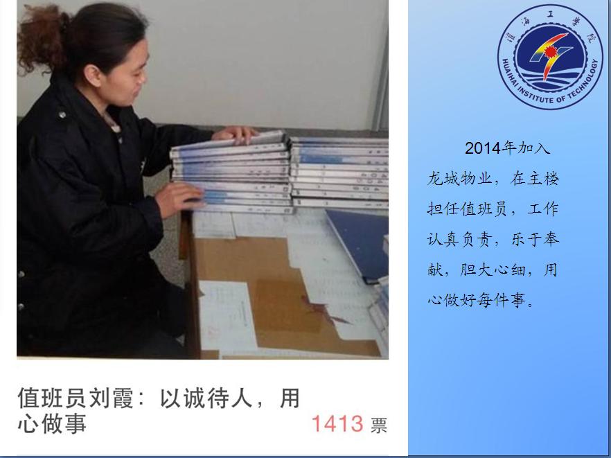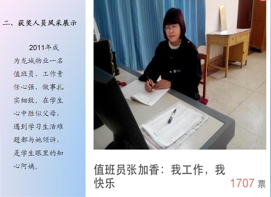为积极响应学校“校风建设年”活动号召,扎实推进务实、高效、勤政、廉洁后勤作风,不断提高物业服务水平和质量,强化物业公司员工责任意识、服务意识,引导物业员工全心全意地为师生提供优质服务。由后勤处主办,学生处协办,历时近一个月,采用师生网络微信投票形式,对所有物业参赛人员的工作状态、精神面貌、服务方式、服务效率等方面表现进行了全面投票评比。本次活动共获得网络微信关注度28793人次,累计投票23675次。经过激烈角逐,有19名参赛人员脱颖而出,分获大赛的一、二、三等奖,部分物业公司分获组织奖和最佳团队奖。会议首先播放了活动期间参赛人员图片集锦,再现了参赛人员日常工作点点滴滴,学生处李春副处长宣读了获奖名单,五位获奖代表分别代表楼宇值班员、公寓值班员、绿化养护、维修工和项目经理不同岗位进行了交流发言,毛宝海处长最后做了全面总结,对参与此次活动各位同仁表示衷心感谢,对活动中取得优异成绩各位物业员工表示热烈祝贺,对做好今后物业服务工作提出了更高的、明确的要求。