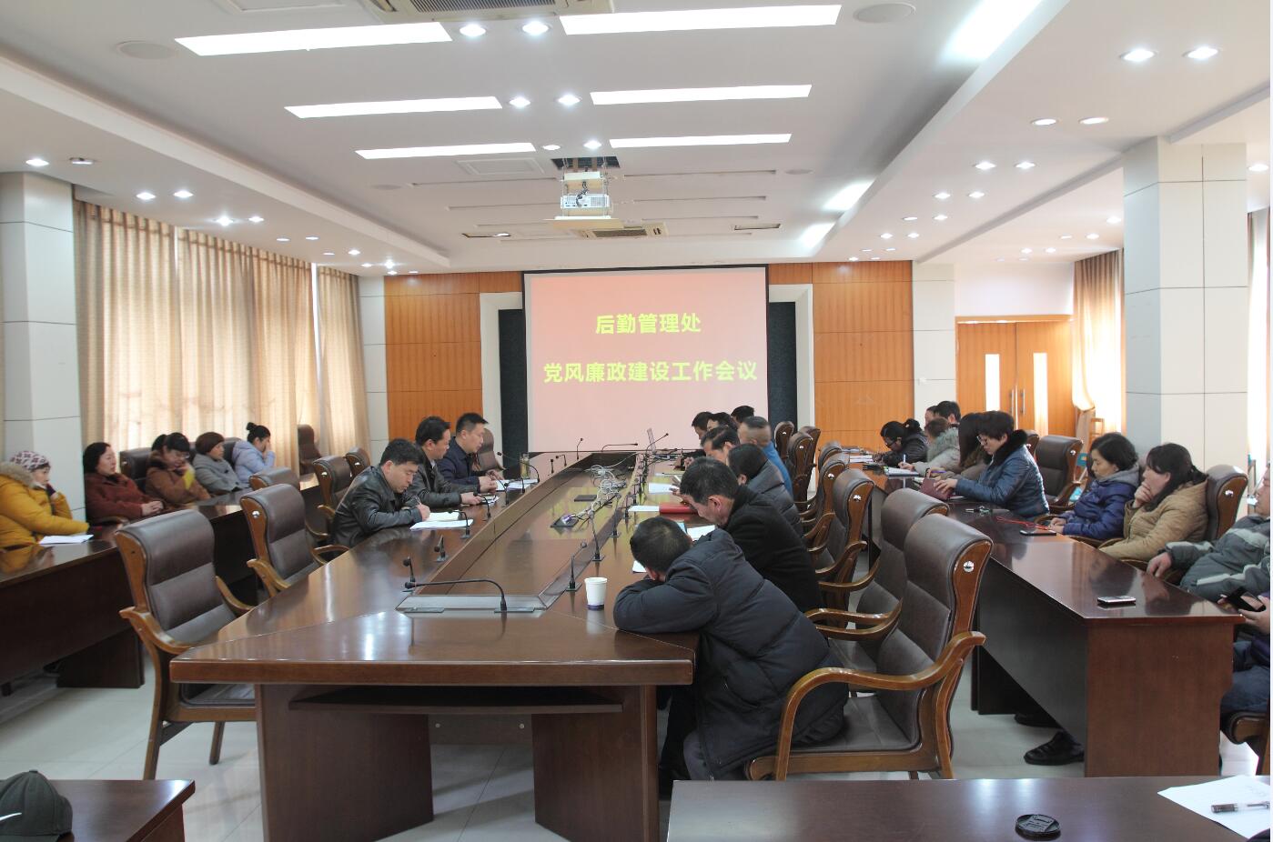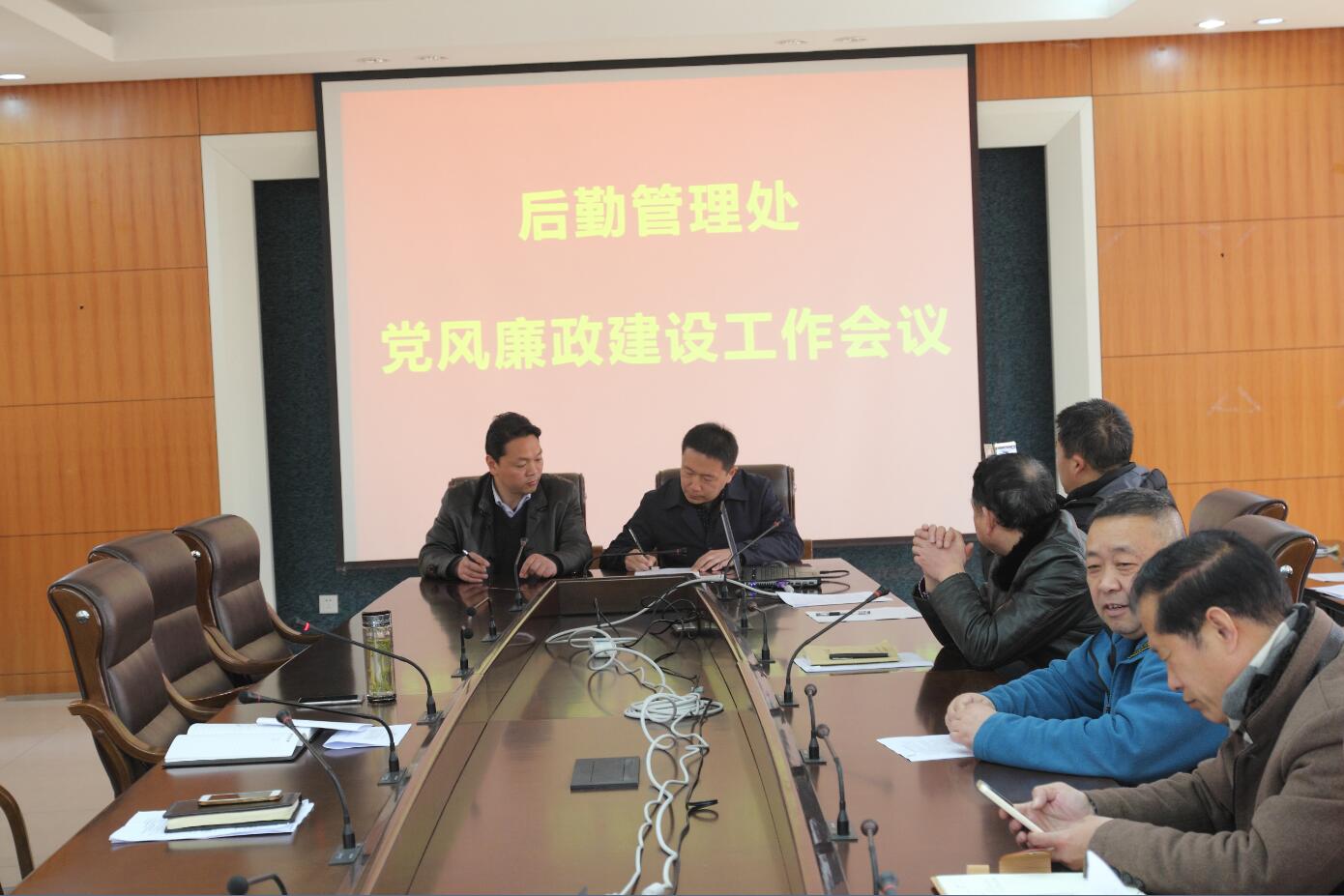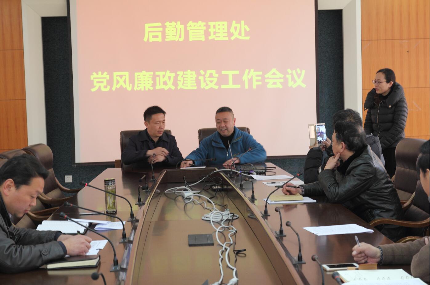 3月29日下午,后勤管理处在文渊楼二楼会议室组织召开党风廉政建设工作大会。后勤处领导班子、各科室负责人、所有后勤职工及物业公司项目经理参加了会议。会议由冯源副处长主持。