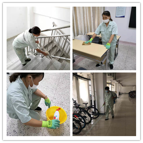这次消杀范围主要针对兴海楼、筑海楼、学生公寓的楼梯扶手、窗户把手、教室内课桌椅子、门把手、塑料门帘等区域,消毒用“八四”消毒液严格按照1:150配对比例进行擦拭。盥洗区、卫生间、走廊、楼梯间、垃圾箱、车库等重点消杀区域用杀虫剂进行消杀。消杀过程中,物业工作人员严格按照操作规范,按比例配兑杀虫剂进行喷洒,不放过一处卫生死角,全面彻底进行。