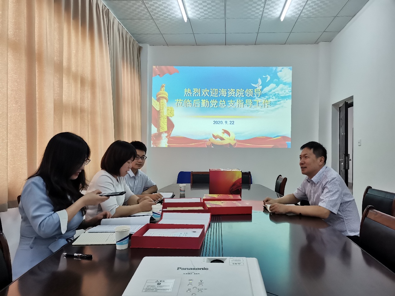 冯源介绍了后勤党总支的基本情况,与海资院党政领导共同查阅了后勤党总支的各项党建资料,重点就全面从严治党清单的落实、自查自纠工作的开展、党政联席会、党总支会、理论中心组学习以及党支部战斗堡垒和党员先锋模范作用发挥方面,进行了详细的介绍。