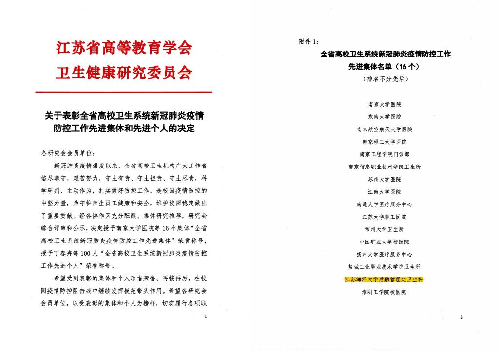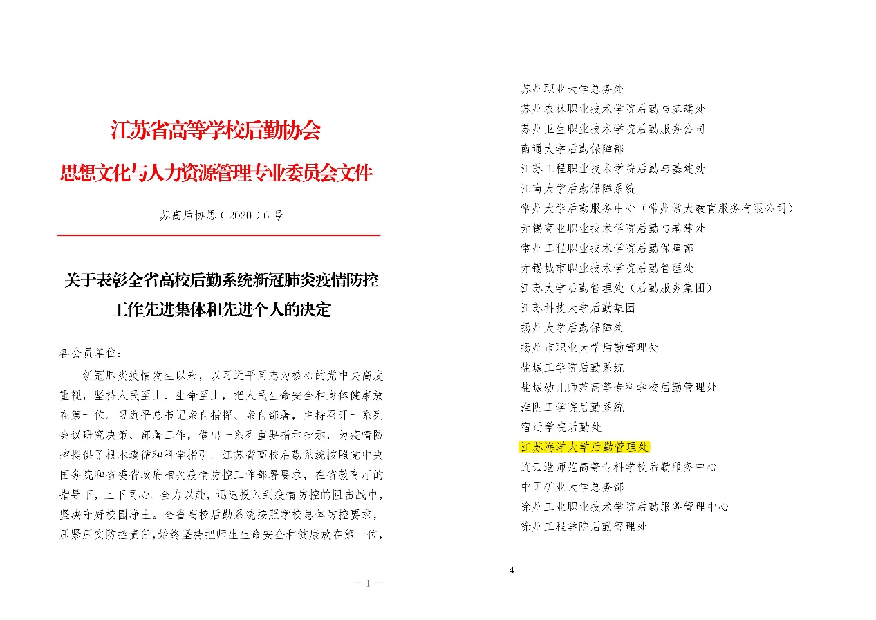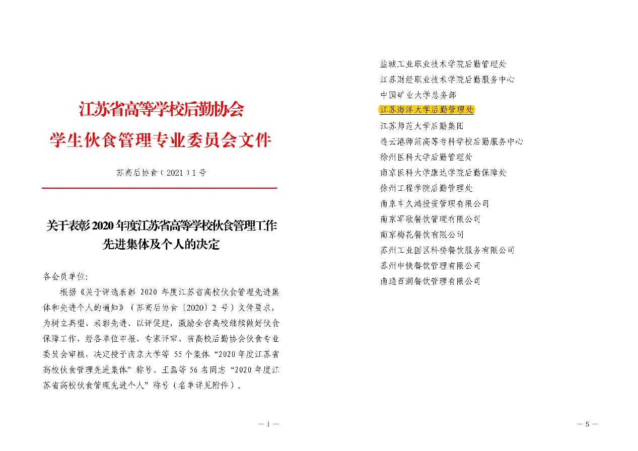 近日,我校后勤管理处、饮食服务总公司喜获多项荣誉。2021年1月,江苏省高等学校后勤协会学生伙食管理专业委员会发文表彰“2020年度江苏省高等学校伙食管理工作先进集体和个人”(苏高后协食﹝2021﹞1号),江苏海洋大学后勤管理处喜获伙食管理工作先进集体;江苏省高等学校后勤协会思想文化与人力资源管理专业委员会发文表彰“全省高校后勤系统新冠肺炎疫情防控工作先进集体和先进个人”(苏高后协思﹝2020﹞6号),江苏海洋大学后勤管理处荣获先进集体,并有1人获先进个人荣誉称号;江苏省高等教育学会卫生健康研究委员会发文表彰“全省高校卫生系统新冠肺炎疫情防控工作先进集体和先进个人“,江苏海洋大学后勤管理处卫生科喜获先进集体,并有1人荣获先进个人。