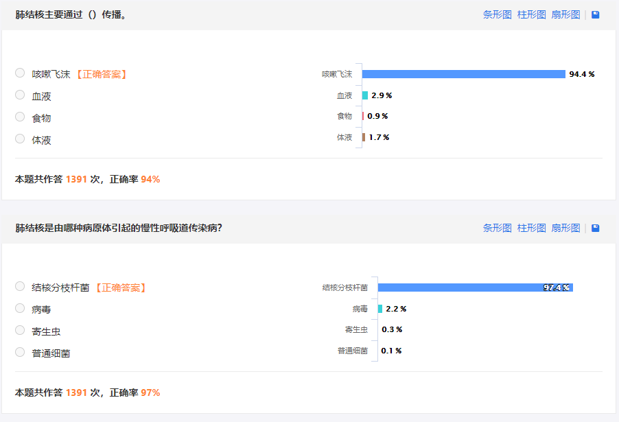 根据参与答题统计结果,全校共1391名师生给出了完整作答。答题正确率平均达到96%。这种网络答题方式是行之有效的。据了解,很多同学答题是一个宿舍多人共同完成的,并且网络答题的方式新颖,较其它方式更方便更易组织更易操作;学员参与网络答题后,可以在团委PU网络平台上申领B类学分,大大增加了学生的答题兴趣。此次活动,将结核病的重点知识线上线下相结合,拓宽了知识吸收有效渠道,提升了知晓率。