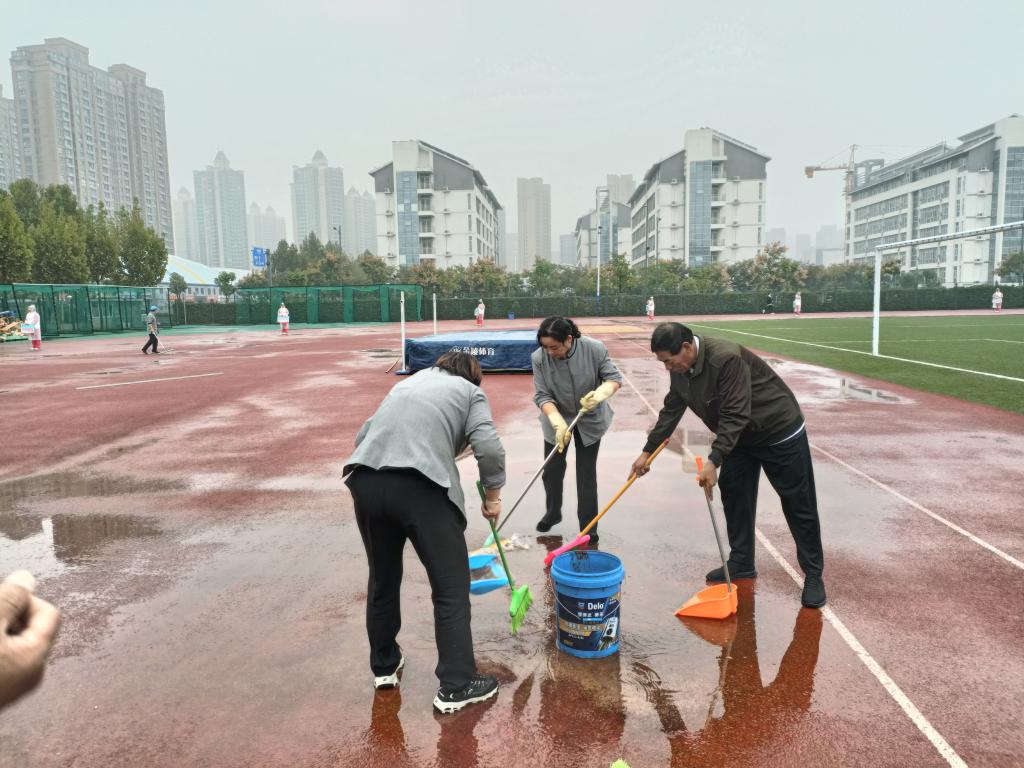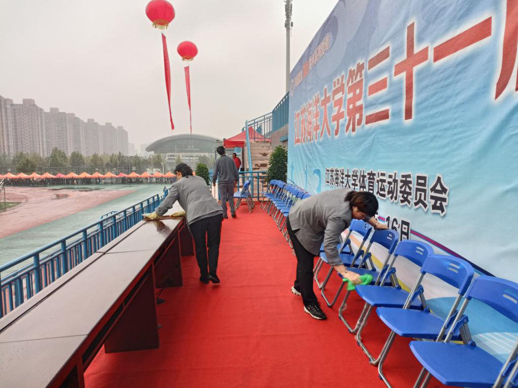 10月13日,在前期常规保洁的基础上,后勤管理处苏宁物业组织人员对运动场进行了一次全面的卫生大扫除,除草、铲胶、捡拾垃圾,并对看台进行拉网式检查,确保不留卫生死角,使整个运动场焕然一新。