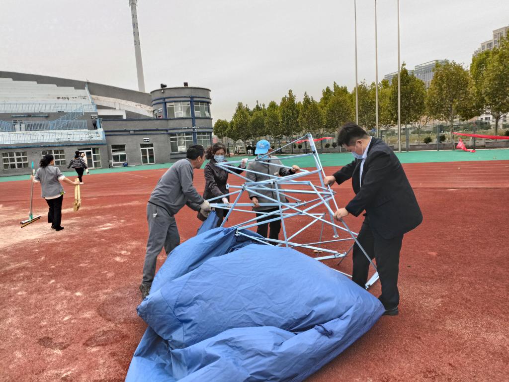 10月14日,银河物业工作人员在体育场周边搭起二十顶帐篷,供各学院学生使用,并对整个场地的卫生和水电设备进行了再一次全面系统的检查,晚上七点,各项准备工作就绪。