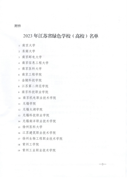近日,江苏省教育厅等四部门联合下发《关于公布2023年江苏省绿色学校(高校)名单的通知》(苏教发函〔2023〕200号),我校以及南京大学等36所高校一起被认定为“江苏省绿色高校”。